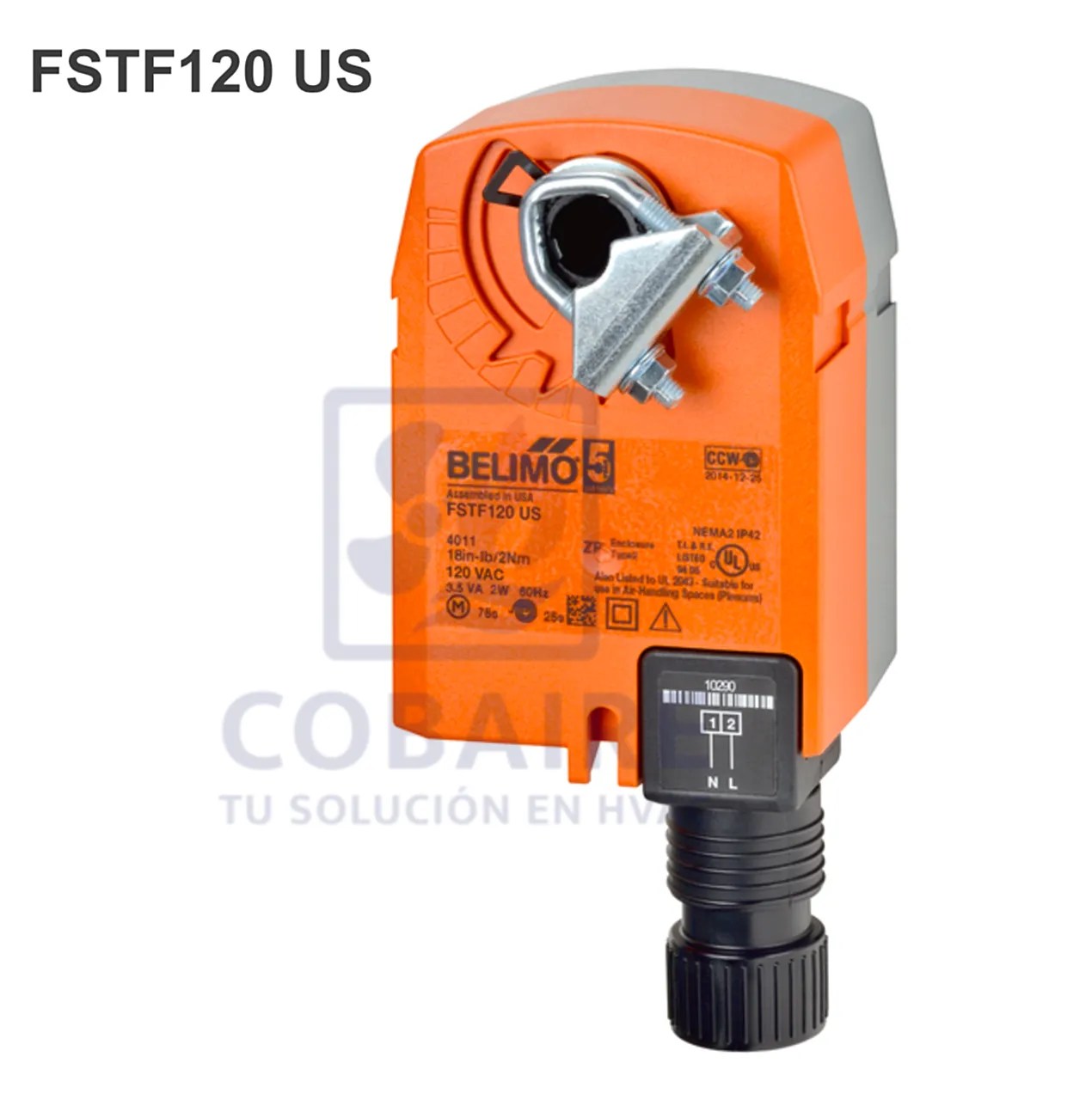 Actuador electrónico de 18 in-lb, acoplamiento directo, con resorte de retorno, señal de control on-off, tiempo de rotación < 75 seg. para compuerta fuego ó humo, alimentación a 120 VAC.