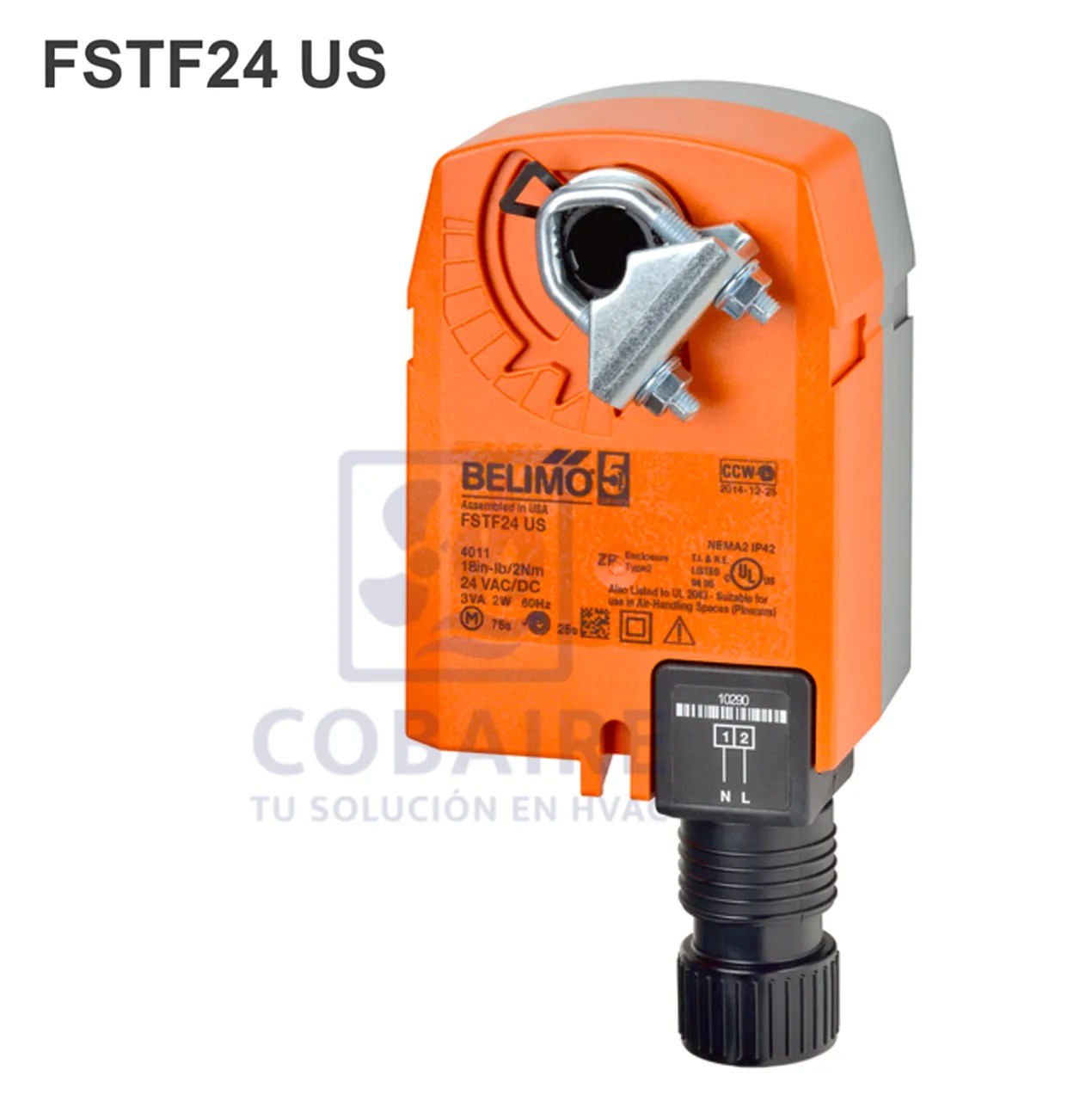 Actuador electrónico de 18 in-lb, acoplamiento directo, con resorte de retorno, señal de control on-off, tiempo de rotación < 75 seg. para compuerta fuego ó humo, alimentación a 24 VAC.